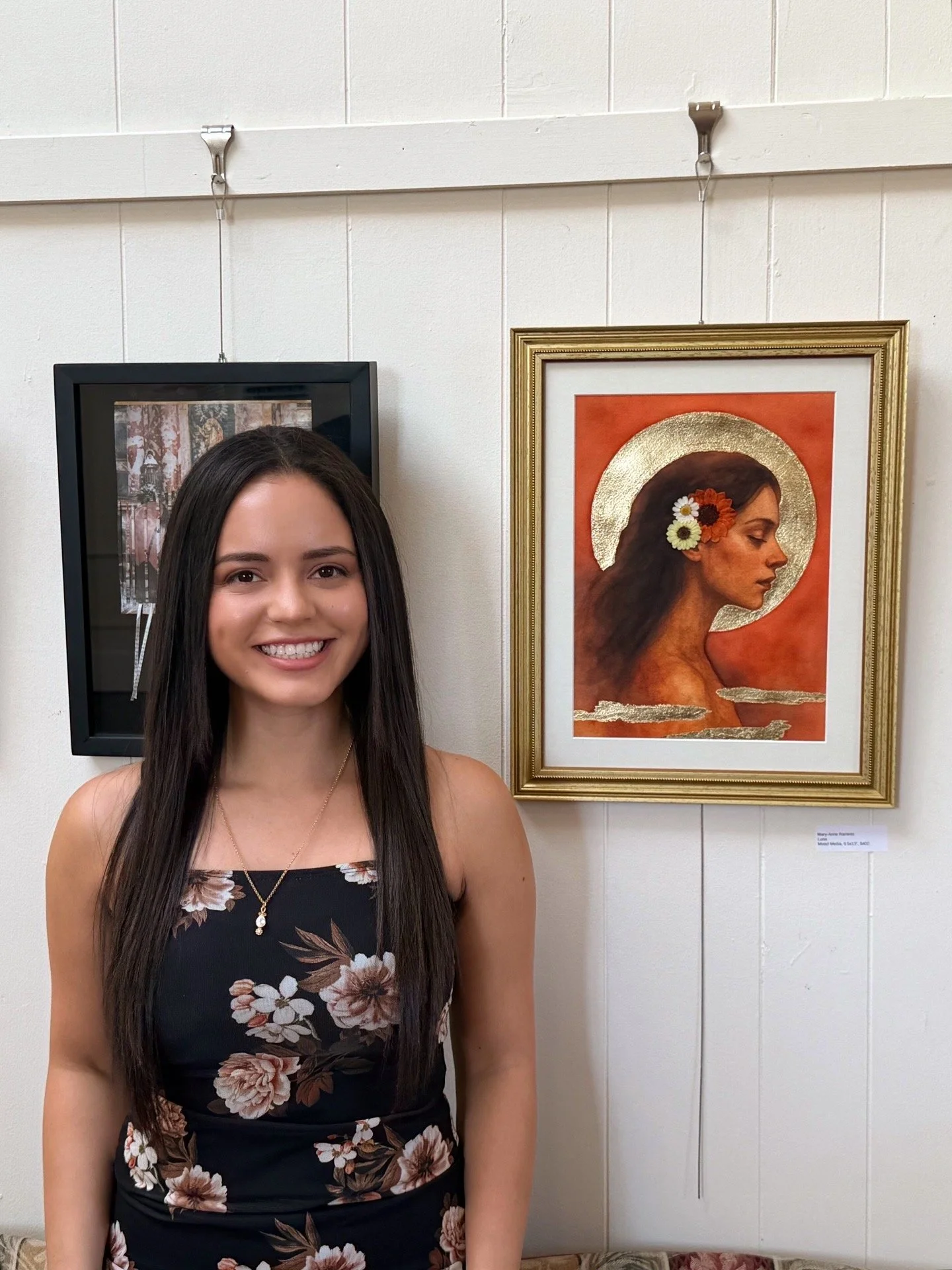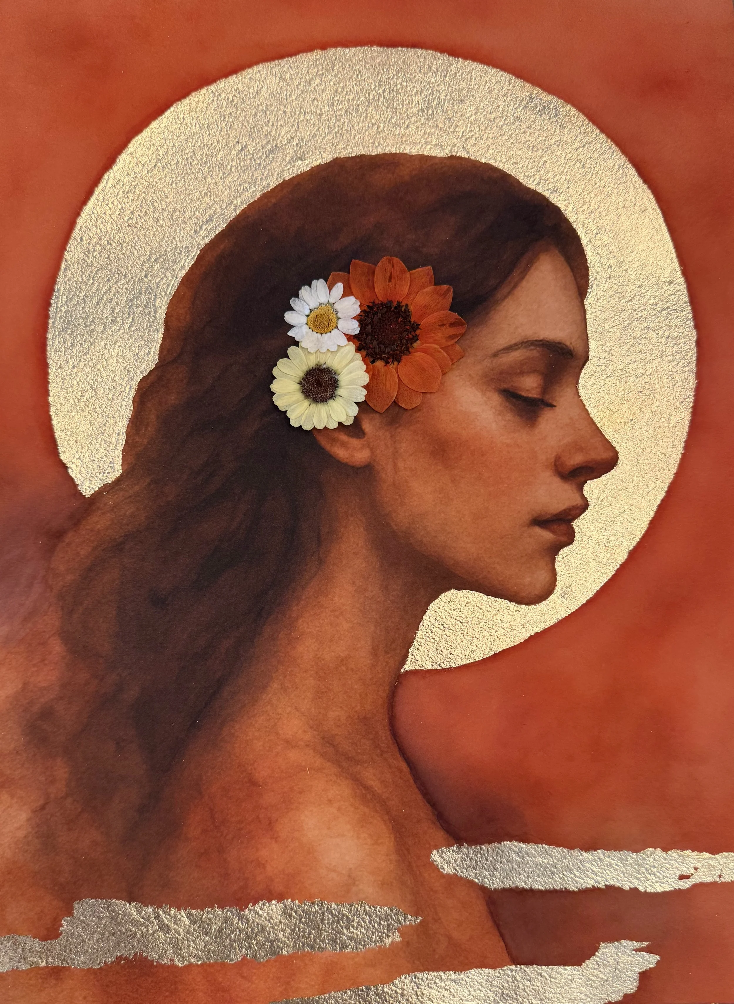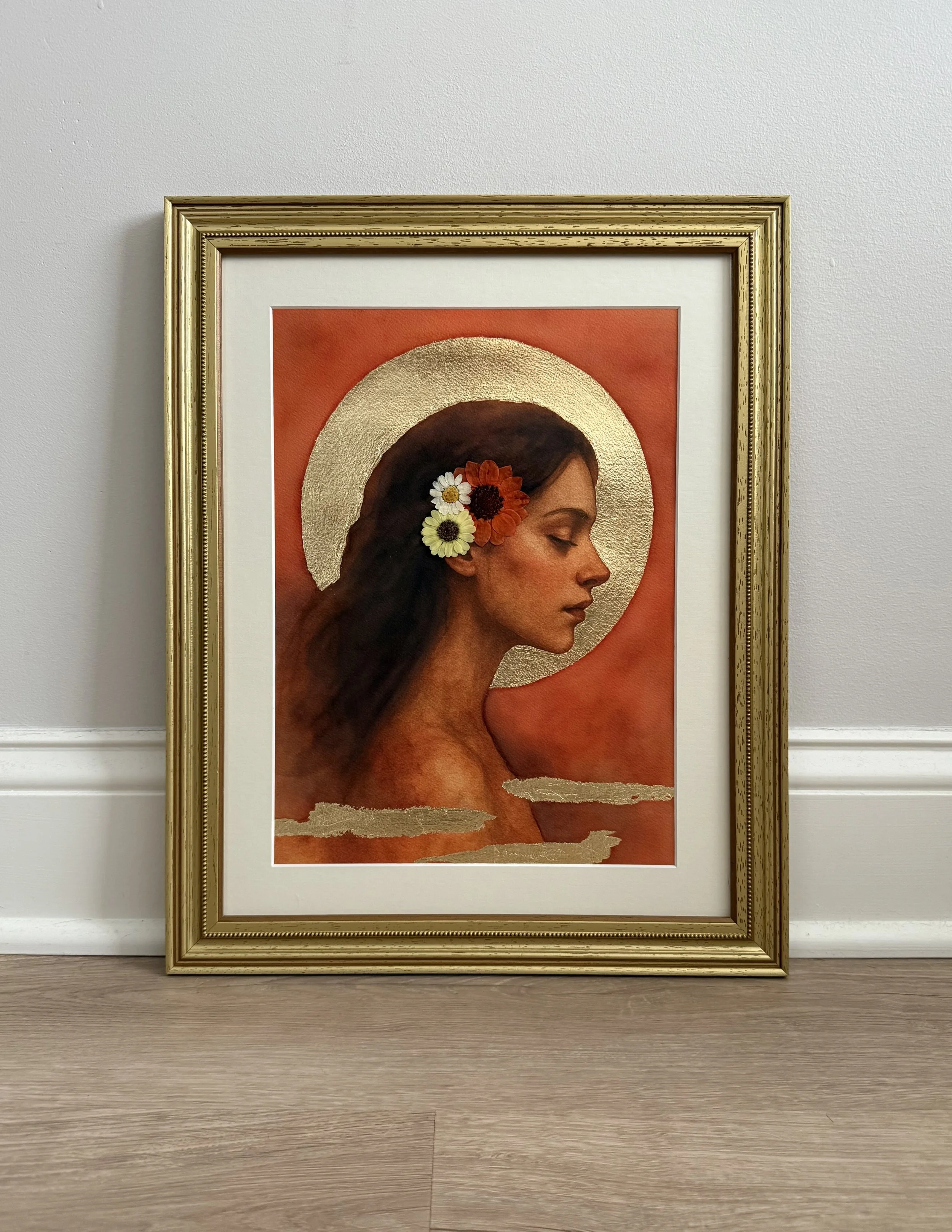 Luna evokes the energy of the Maiden: youthful, innocent, and connected to cycles of growth and becoming. The moonlike halo and flowers symbolize renewal and the sacred rhythms of nature, while her closed eyes suggest inner peace and reflection. By combining painting with natural elements and gold leaf, I wanted to honor the Maiden as part of the larger cycle of the Three-Faced Moon.