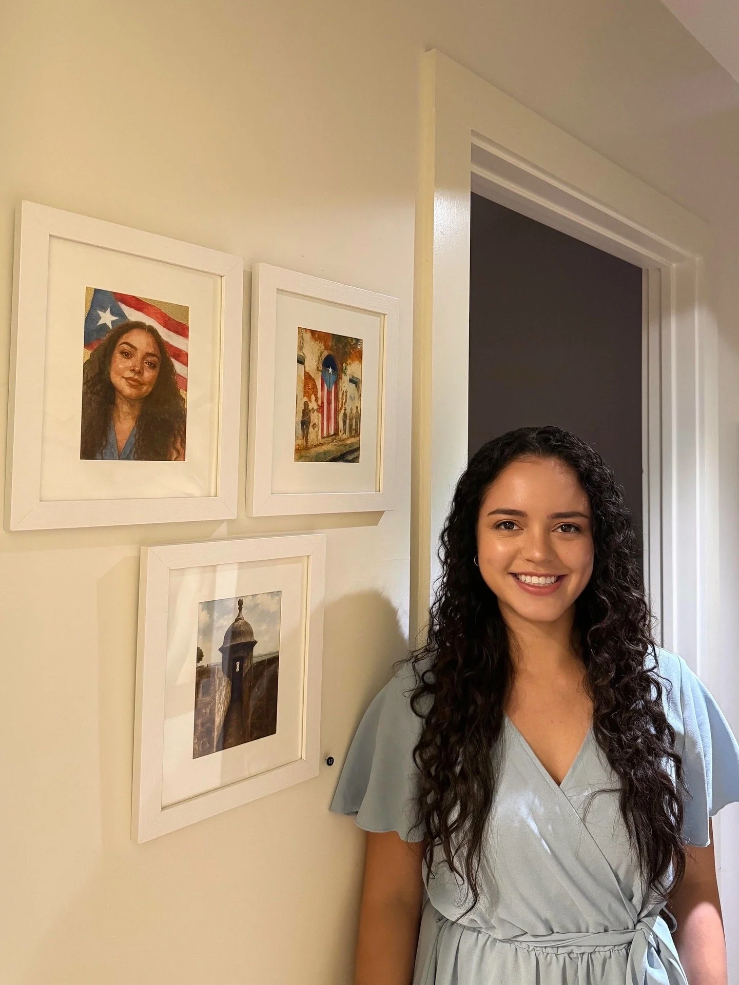 The self-portrait, titled Boricua, is a celebration of identity, an affirmation of where I come from and the pride I hold in my culture. The other pieces reference iconic imagery of Old San Juan: its colorful architecture, historic doorways, and the watchtower of El Morro. I approached these scenes like a scrapbook or a collection of postcards, each one holding a fragment of a memory from my visit.